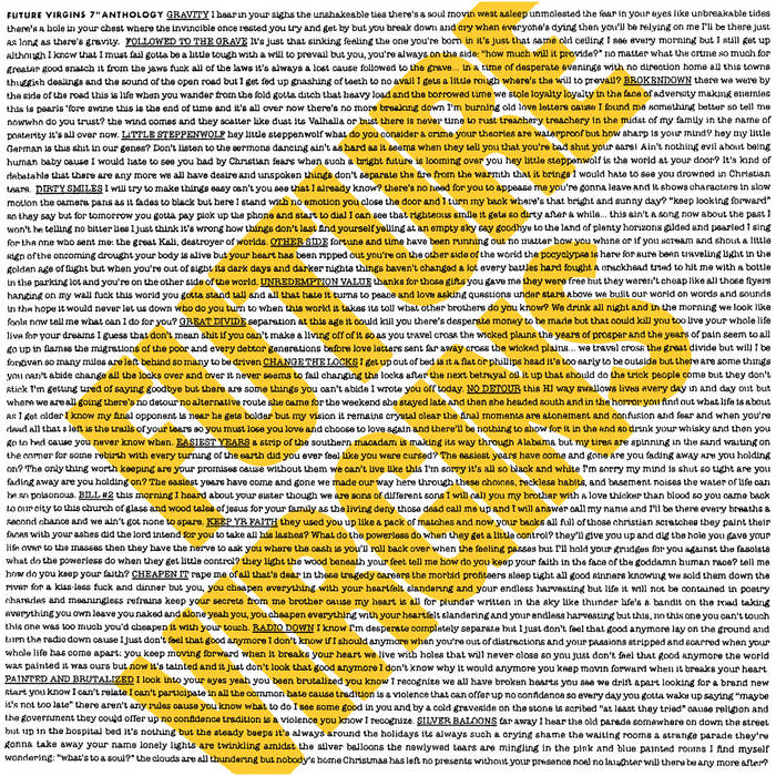 200 pressed on opaque yellow and 300 on black vinyl. Loyal fans of Chattanooga’s FUTURE VIRGINS finally have the band’s early recorded material in one place! The Dirty Smiles 7” Anthology LP contains the first three 7”s released between 2006 and 2009 on Plan-It-X-South, and 2 tracks from 2010’s Do Ya Hear We compilation. More than just the convenience of 6 less side changes required to hear all these tracks, the LP is also sonically superior, having been remastered for maximum punch and clarity. What stands out the most here is how fully-formed the band actually was from the beginning. A decade into their career that continues to pick up speed (2 full-length LP’s came after these early recordings in quick succession, with a third forthcoming), you’re reminded of how intact the songwriting and playing has always been. Present day Future Virgins shows us something we rarely get to see in the fickle punk world – a long-running band with no member changes that stays perfectly on target. Quite a concept, right? Dirty Smiles isn’t showing us the blueprint for that (look even further into Chattanooga punk history for that); it’s revealing just why the band has endured and why their music will live on.