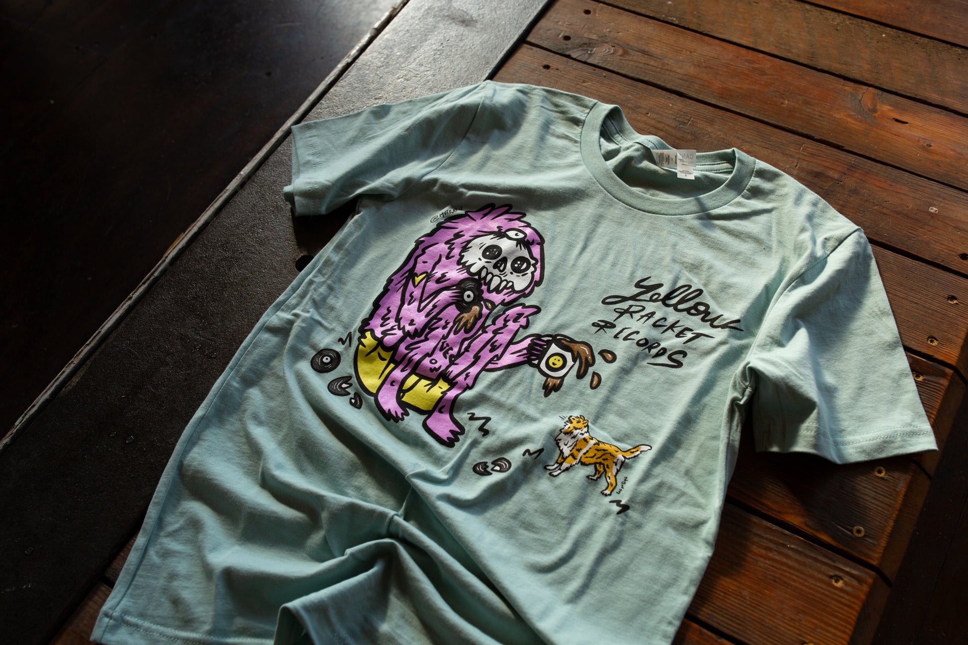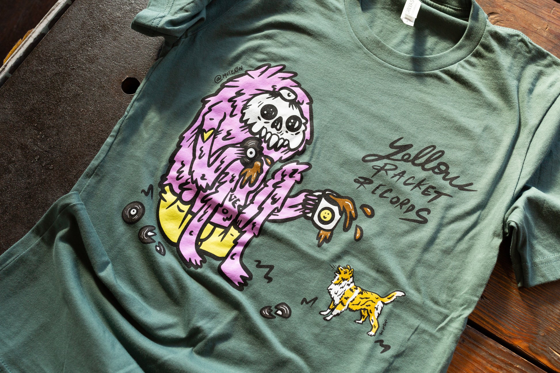 Ultra-comfy Bella Canvas tees with design by Justin Butts. A faceoff between a record-eating Monster and the Yellow Racket collie.