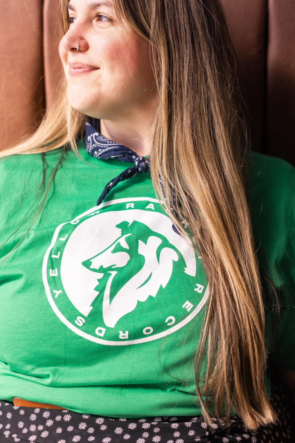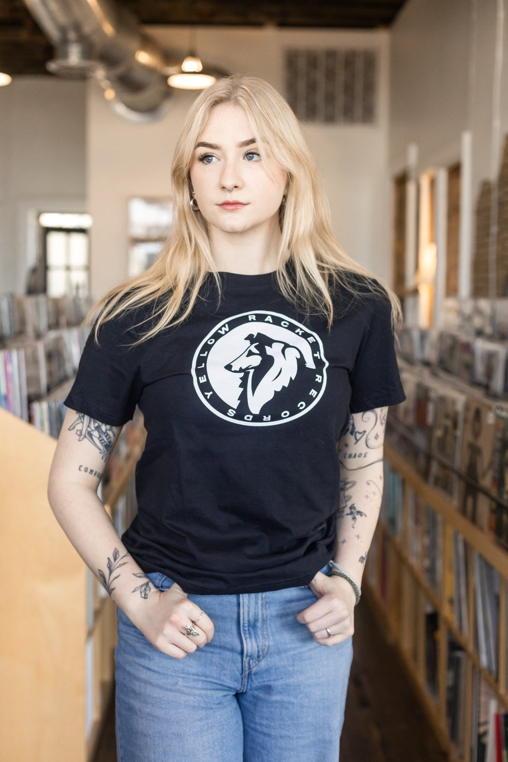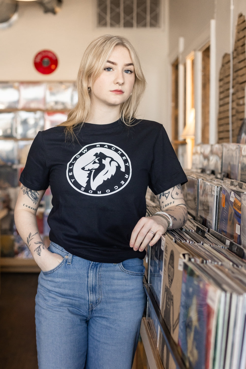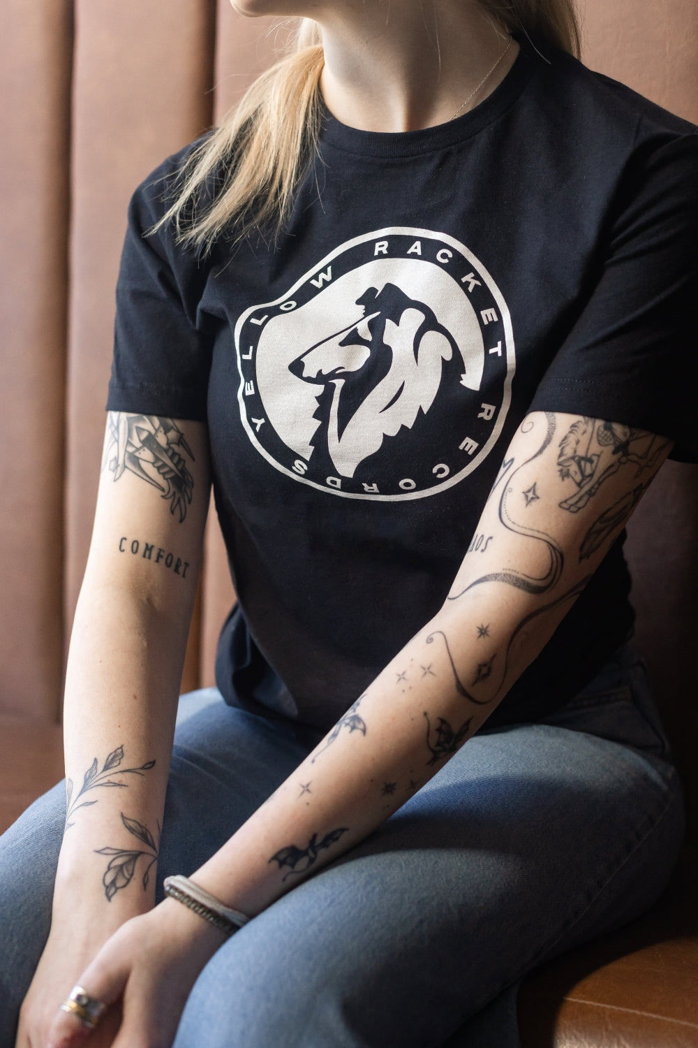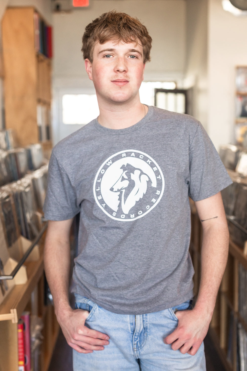 Just your run-of-the-mill, ultra-comfy, laze-about Gildan softstyle tee with a classic Yellow Racket collie in white ink and "Yellow Racket Records" in text around the edge.