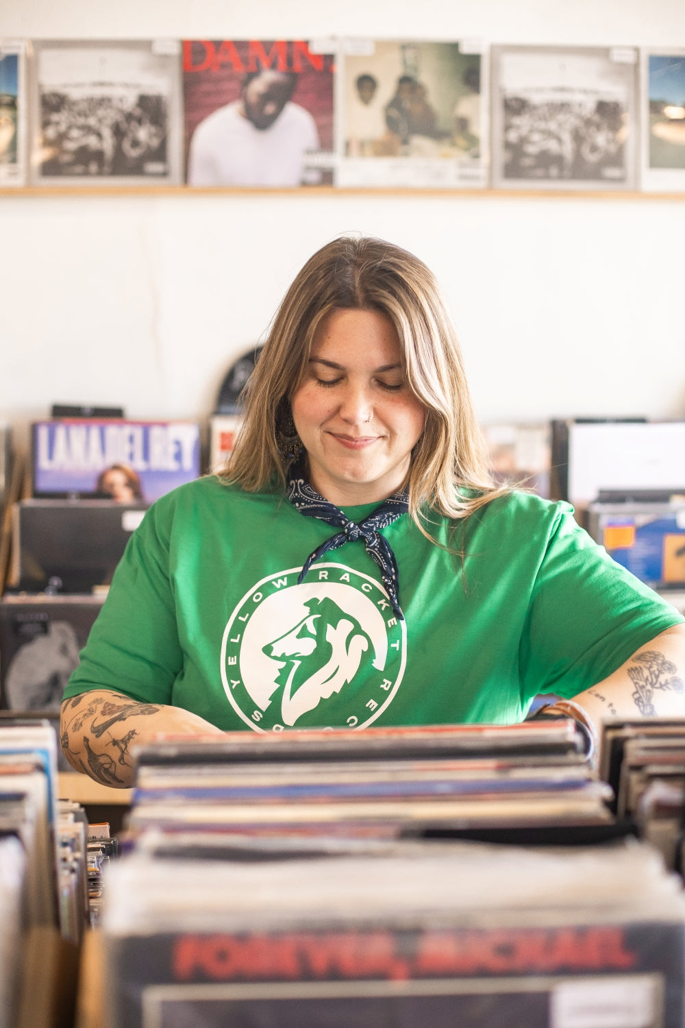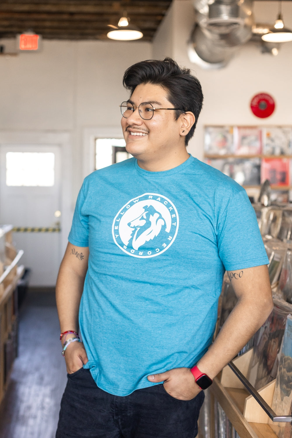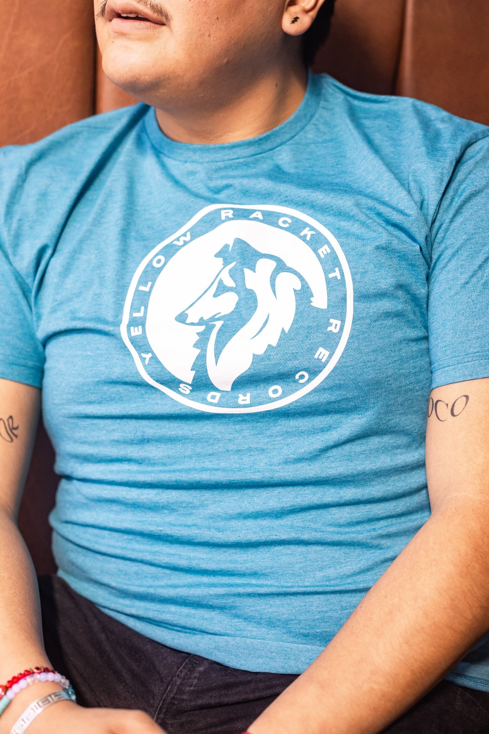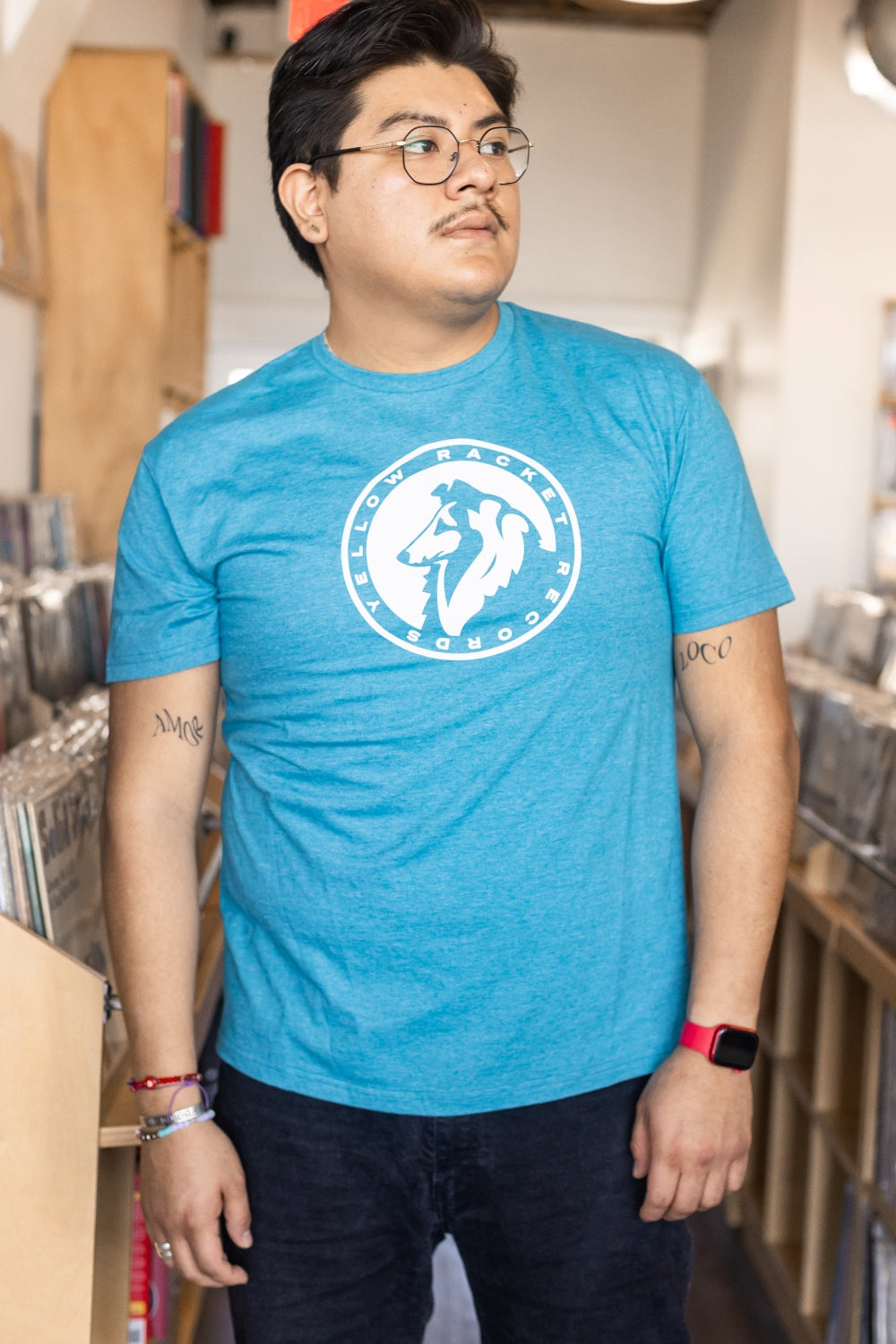 Just your run-of-the-mill, ultra-comfy, laze-about Gildan softstyle tee with a classic Yellow Racket collie in white ink and "Yellow Racket Records" in text around the edge.