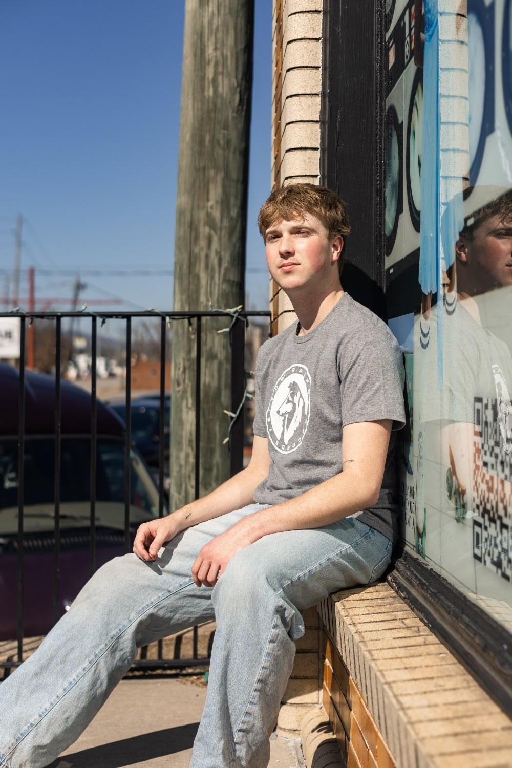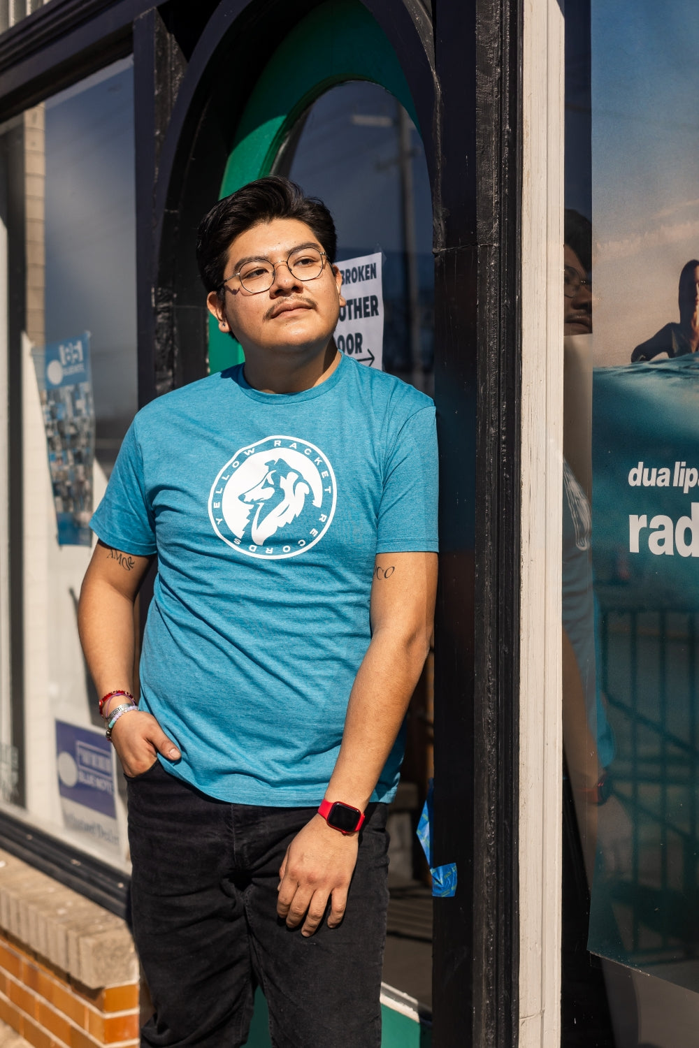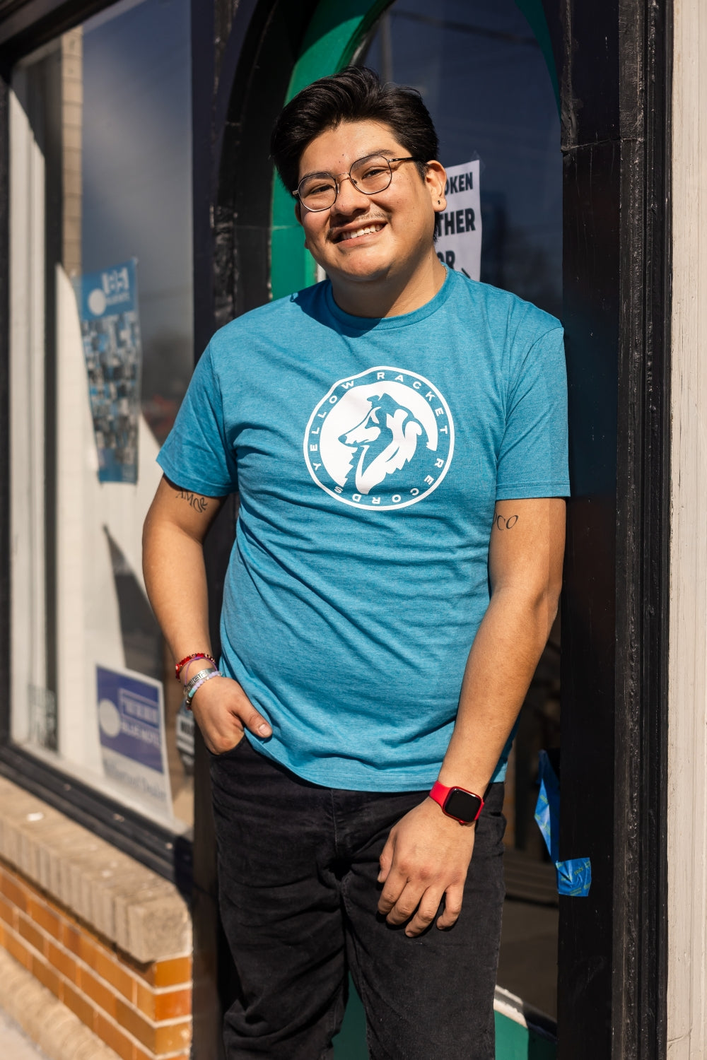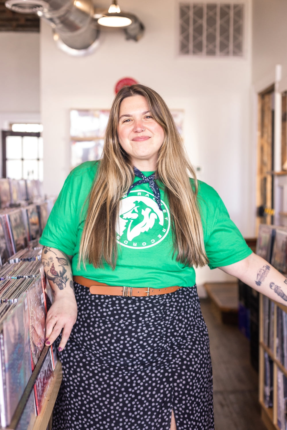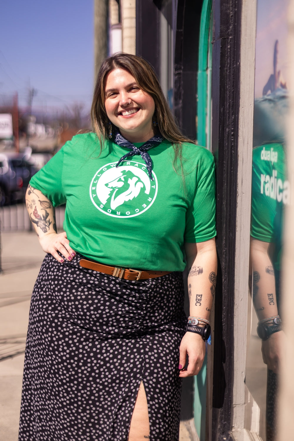 Just your run-of-the-mill, ultra-comfy, laze-about Gildan softstyle tee with a classic Yellow Racket collie in white ink and "Yellow Racket Records" in text around the edge.